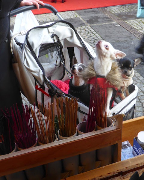 | Die Dame schiebt ihre drei bekleideten Hündchen, die im Kinderwagen zittern und schnüffeln, an einer Reihe Räucherstäbchen vorbei. |