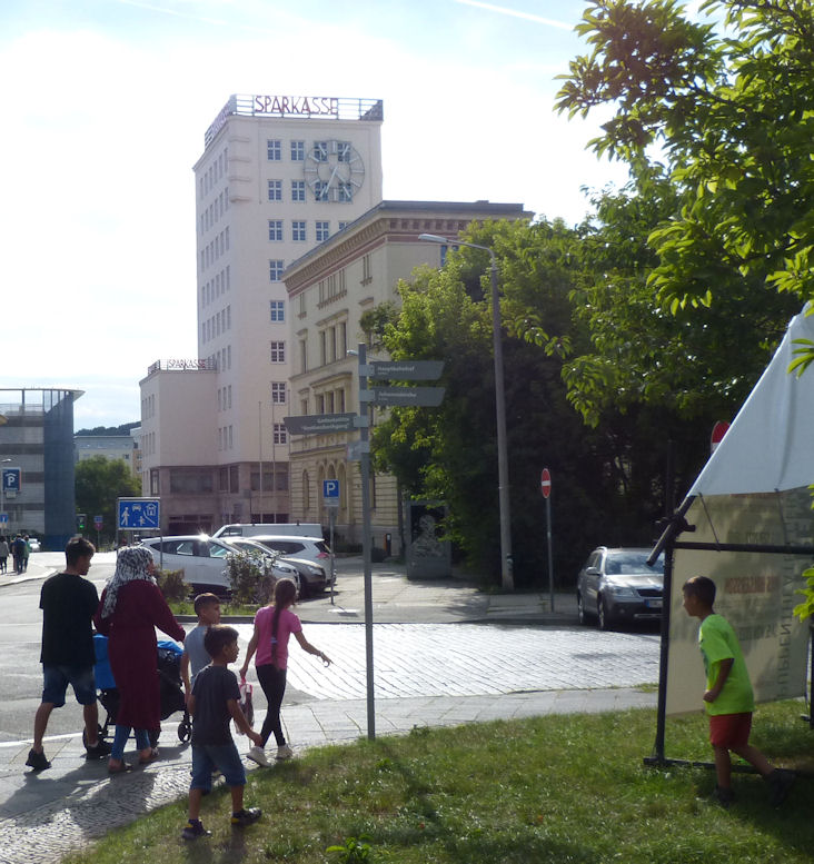Die Uhr an der Sparkasse zeigt 16.35 Uhr. Gegen 17.00 geht mein Zug vom Bahnhof Gera zurück zum Bahnhof Greiz.
