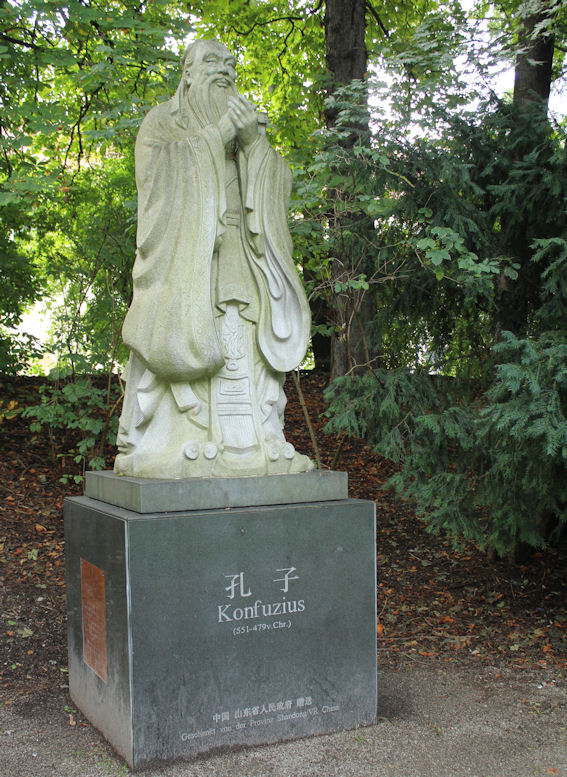 Den Herrn kennt jeder, sein Name im Sockel: Konfuzius (551-479 v. Chr.). Wie der Herr in den verschwiegenen Park kam, steht auch im Sockel: Geschenkt von der Provinz Shandong/VR China