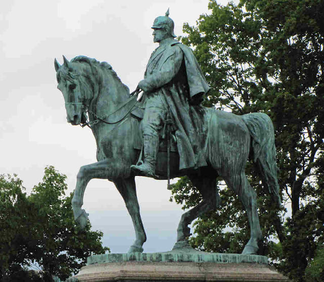 Diesen strammen Stein-Koloss bestaunen Besucher seit 1913. Doch der Terminator Maximus, Kaiser Wilhelm II, endete als Gast der Holländer, der sich beim Holzhacken fit hielt. Der danach folgende Volks-Verführer hat keine Denkmäler. Seine Symbol-Sprache verfolgen die Strafbehörden, als verfassungsfeindlich.