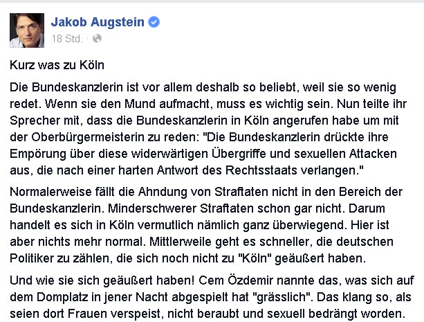 Und wie sie sich geäußert haben! Cem Özdemir nannte das, was sich auf dem Domplatz in jener Nacht abgespielt hat "grässlich". Das klang so, als seien dort Frauen verspeist, nicht beraubt und sexuell bedrängt wordenAlso Mädchen, nun habt Euch nicht so weiblich heulend für das bisschen Gang-Bang-Gekrabbel der furchtbar fruchtbaren Spermien-Spritzer, die eskalierend über euch ejakulieren. Kein Kanibale hat auch nur eine von euch abgebrühten Hühner (nachts auf dem Domplatz!) gerupft, gebraten und gefressen. So denkt Herr Augstein!
