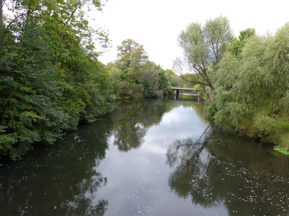 Durch die Stadt fließt ruhig der Fluß, an dem im Sommer Liegestühle im Sand Urlaubsgefühle schenken.
