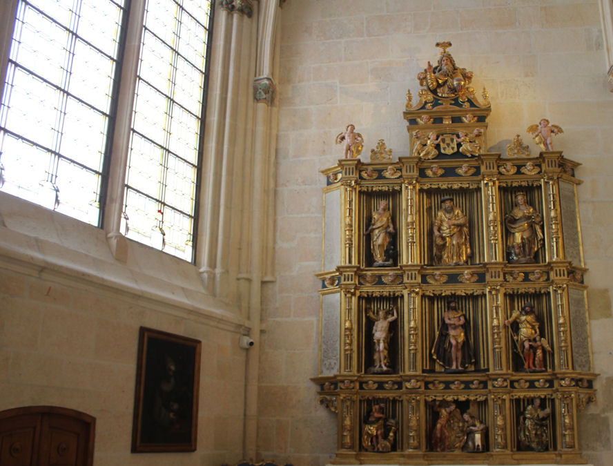 Die Smartphone-Führung nennt dies "Hauptretabel", ein anderer Ausdruck für Altar. in der zweiten Hälfte des 16. Jahrhunderts im Renaissancestil als Kombination von Bildwerken, Holz-, Einlege- und Vergoldungsarbeiten verfertigt. Staunend steht der Pilger vor dem vierstöckigen Kunstwerk.