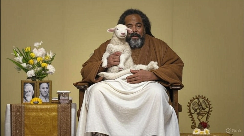 Meister Mooji lehrt Schüler. KI hat Mooji das Lamm Gottes in den Arm gelegt. Die Bilder auf dem Tisch zeigen Moojis Lehrer: Ramana und Poonjaji. Meister vermitteln Schülern, die dafür empfänglich sind, spiritülle Einsichten und erleuchtende Erlebnisse.